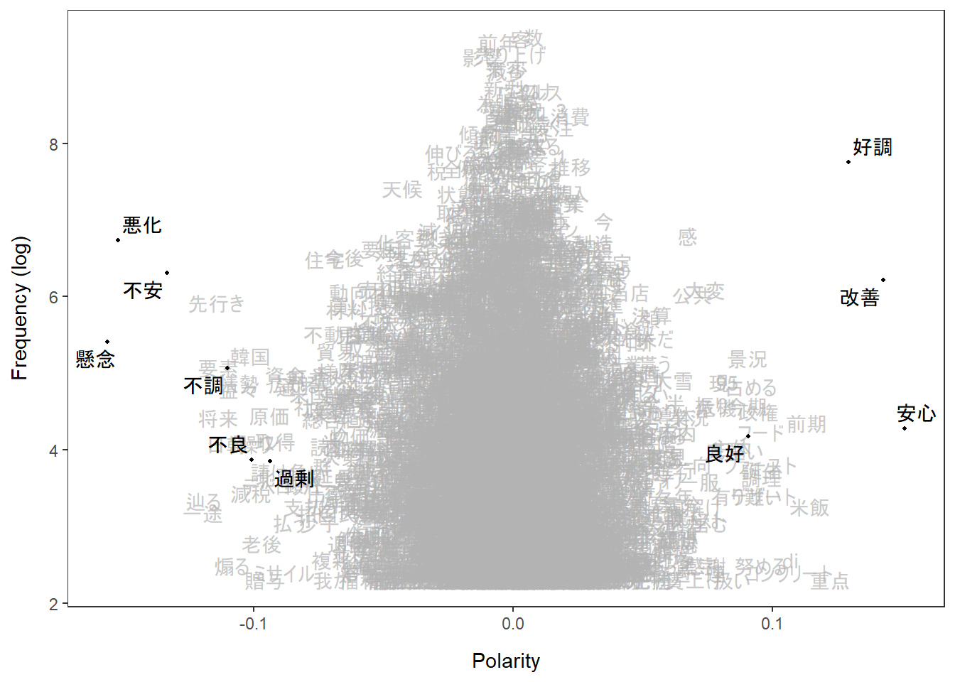 上記の図は縦軸が頻度(対数)、横軸が極性(Polarity、センチメントスコアと解釈)となっています。極性が大きく、頻度が高い単語は種語が多く、頻度の高い単語はゼロ周りに分布していることが確認できました。 語調の強い単語以外は極性の絶対値が低いと出るようで、日本語のように強い表現があまり取られない言語では機能しずらいのかもしれません。